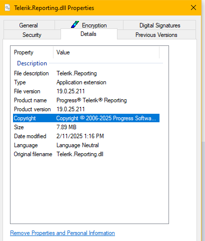 6) The detail of the Telerik.Reporting.dll file is shown below if it can help with anything.