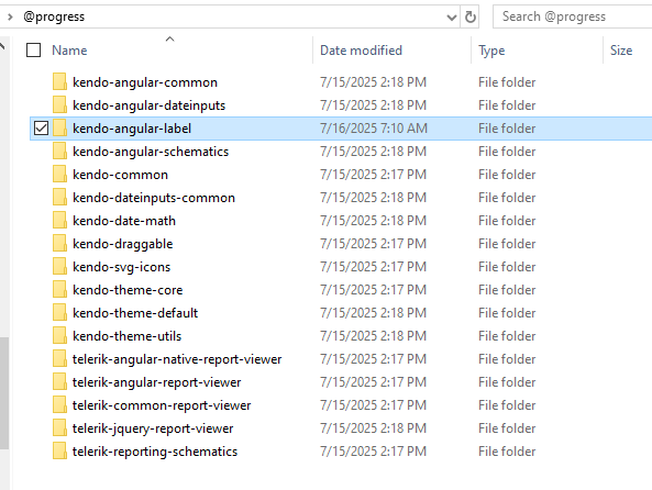 3) There is no "Keno-angular-label" package in the @progress folder as shown in the list below.