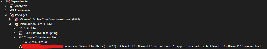 My project has a dependency of version 6.2.0 for Telerik.Ui.for.Blazor and my project wont compile without this specific version