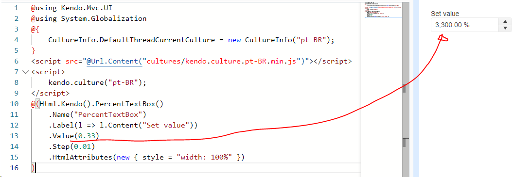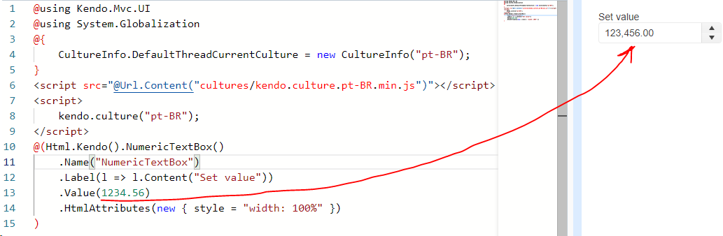 Looks like there is some kind of issue when trying to use the .NET Core wrapper for NumericTextBoxFor while using the culture pt-BR.