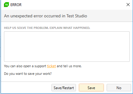 When some specific action causes Test Studio to crash you will see this window (crash-report.png) with the following options: