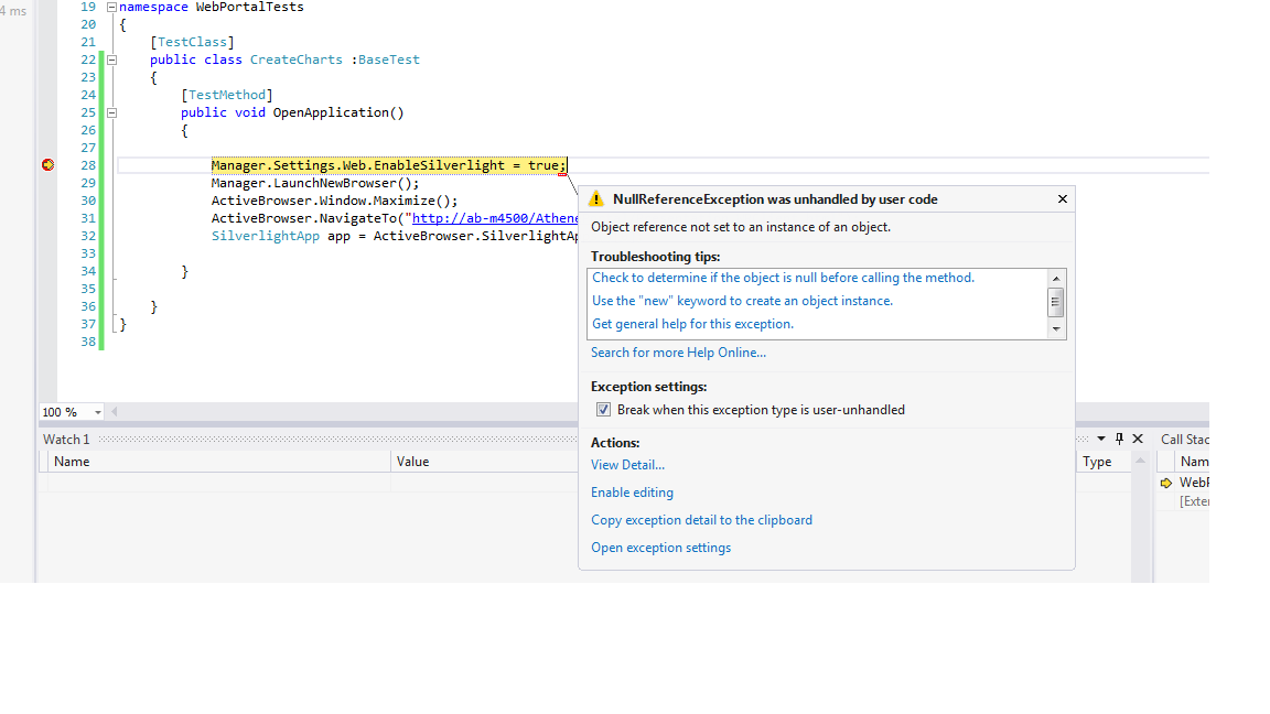 namespace WebPortalTests { [TestClass] public class CreateCharts :BaseTest { [TestMethod] public void OpenApplication() { Manager.Current.Settings.Web.EnableSilverlight = true; Manager.Current.LaunchNewBrowser(); ActiveBrowser.Window.Maximize(); ActiveBrowser.NavigateTo("http://ab-m4500/AthenePortal/Presentation.WRClient.html"); SilverlightApp app = ActiveBrowser.SilverlightApps()[0]; } } } Let me know if you need further assistance. Regards,
