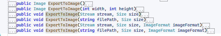 Thank you for the provided image and details. I don't think it is related to the overloads. Upon checking the ExportToImage() method source I noticed that using that version of the method which accepts Stream or string, the method does not return an Image. In that version it is void. The method returns image, when not passing any parameters or only passing the width and height of the exported image. Here are the collapsed version of the ExportToImage() method: