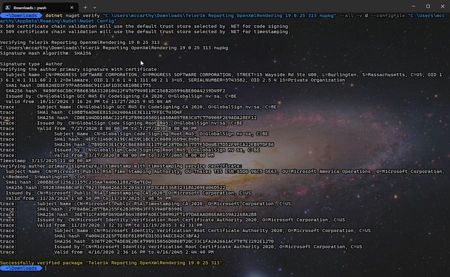 Package 'Telerik.Reporting.OpenXmlRendering 19.0.25.313' from source 'https://nuget.telerik.com/v3/index.json': This package is signed but not by a trusted signer.