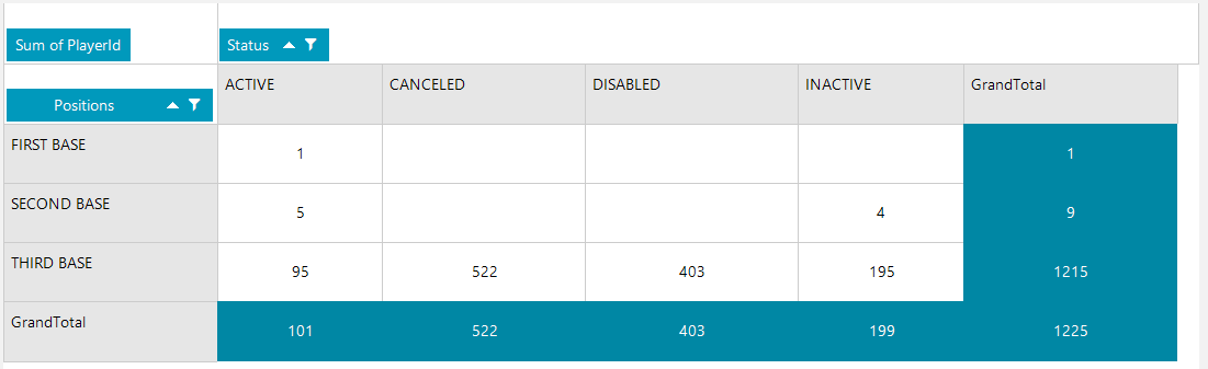 Okay, I guess I didn't highlight the issue. Our Positions column has 4 possible values, but the result set only contains 3 of those possible 4 values. If you look at the example above, "SHORT STOP" has ZERO (0) for all the statuses, indicating no records in the Data Source. We can't get that to show up in our pivot grid, and I can understand why, as we don't have any values in our DataSource with that value in it. The question is, how can we achieve this just by using the raw data from our queries?