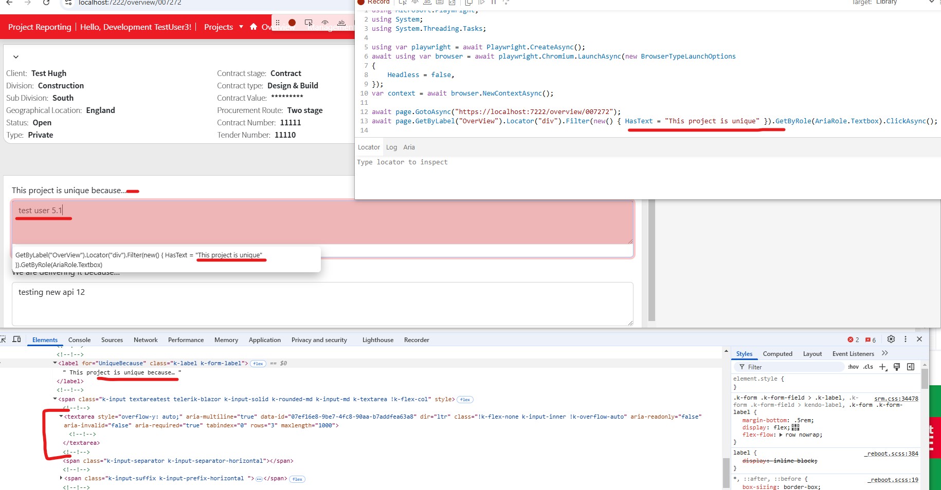 As you can see on the screenshot below when using the playwright code generator it picks the label "This project is unique because…" but I want the Value "test user 5.1" , looking at he HTML generated the value "test user 5.1" is not there , how do I get the value ?