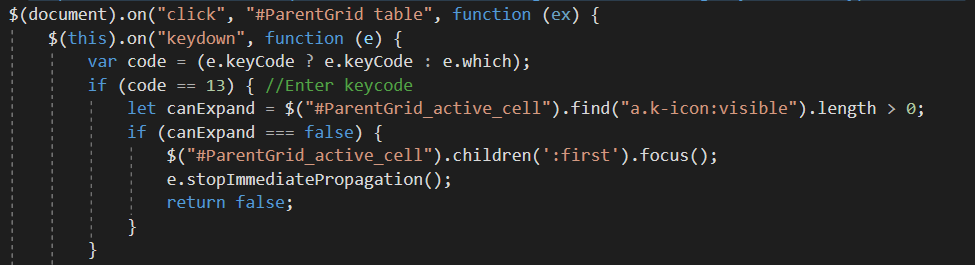 Hi, I've got a grid whose rows expand to show another, templated, grid. I also have clickable links in the cells of the parent grid. Using a mouse, I can click these links directly or click the expansion icon to expand the row. Using keyboard navigation, however, I can only expand the parent row when I press enter. On grids without a templated sub-grid, pressing Enter will focus the link in the parent cell. I would like this behavior to be uniform.