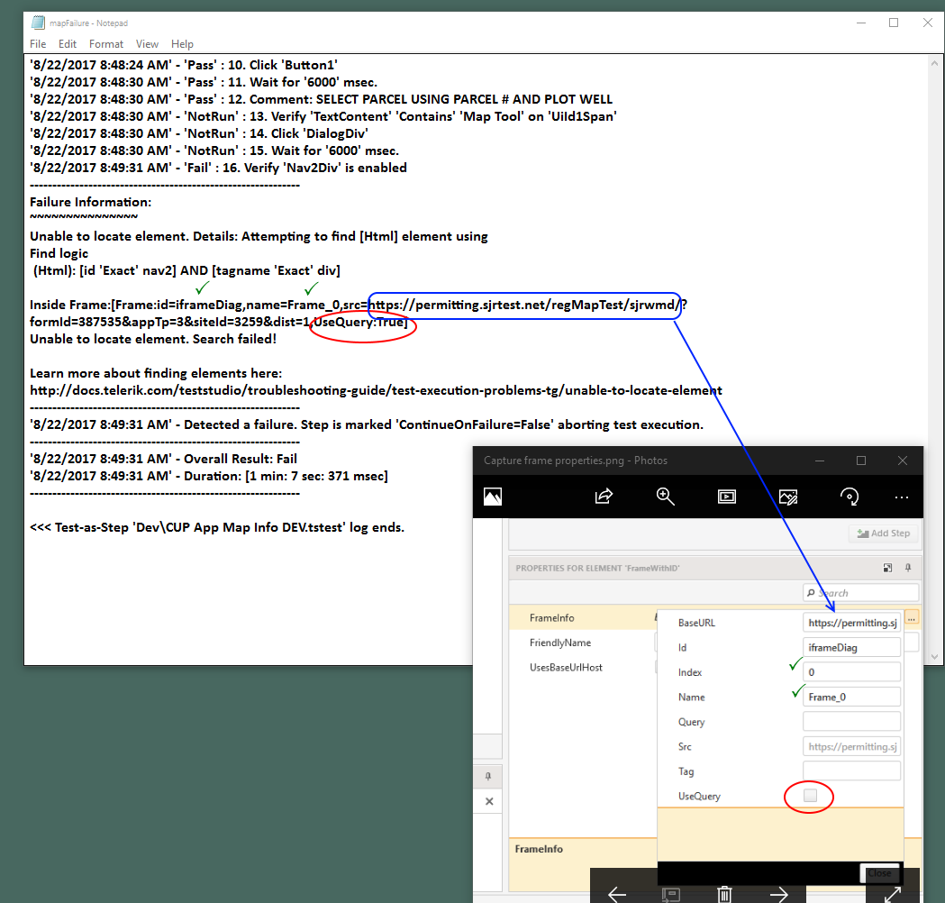 Attached you will see a pic from TestStudio of my frame element and a successful connection using the "NavDiv" element in the frame. On top is a log of a locally run test list and you will see that the frame find logic reverts to using a query. This also happens on a remotely run test list (I also deleted the mongo db on the remote server to ensure no old scripts). Where is it getting this find logic and why does it revert to this rather than simply using the frame id?