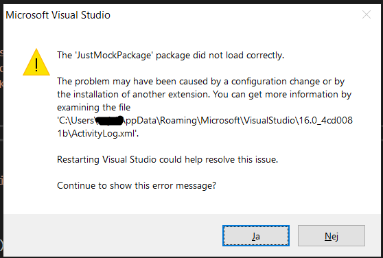 690 ERROR CreateInstance failed for package [JustMockPackage]Source: 'mscorlib' Description: Filen eller assemblyen 'file:///c:\users\foobar\appdata\local\microsoft\visualstudio\16.0_4cd0081b\extensions\alz4b0wd.jii\Telerik.JustMock.VS2017.dll' eller en af dens afhængigheder kunne ikke indlæses. Den angivne fil blev ikke fundet. System.IO.FileNotFoundException: Filen eller assemblyen 'file:///c:\users\foobar\appdata\local\microsoft\visualstudio\16.0_4cd0081b\extensions\alz4b0wd.jii\Telerik.JustMock.VS2017.dll' eller en af dens afhængigheder kunne ikke indlæses. Den angivne fil blev ikke fundet. File name: 'file:///c:\users\foobar\appdata\local\microsoft\visualstudio\16.0_4cd0081b\extensions\alz4b0wd.jii\Telerik.JustMock.VS2017.dll'at System.Reflection.RuntimeAssembly._nLoad(AssemblyName fileName, String codeBase, Evidence assemblySecurity, RuntimeAssembly locationHint, StackCrawlMark& stackMark, IntPtr pPrivHostBinder, Boolean throwOnFileNotFound, Boolean forIntrospection, Boolean suppressSecurityChecks)at System.Reflection.RuntimeAssembly.nLoad(AssemblyName fileName, String codeBase, Evidence assemblySecurity, RuntimeAssembly locationHint, StackCrawlMark& stackMark, IntPtr pPrivHostBinder, Boolean throwOnFileNotFound, Boolean forIntrospection, Boolean suppressSecurityChecks)at System.Reflection.RuntimeAssembly.InternalLoadAssemblyName(AssemblyName assemblyRef, Evidence assemblySecurity, RuntimeAssembly reqAssembly, StackCrawlMark& stackMark, IntPtr pPrivHostBinder, Boolean throwOnFileNotFound, Boolean forIntrospection, Boolean suppressSecurityChecks)at System.Reflection.RuntimeAssembly.InternalLoadFrom(String assemblyFile, Evidence securityEvidence, Byte[] hashValue, AssemblyHashAlgorithm hashAlgorithm, Boolean forIntrospection, Boolean suppressSecurityChecks, StackCrawlMark& stackMark)at System.Reflection.Assembly.LoadFrom(String assemblyFile, Evidence securityEvidence)at System.Activator.CreateInstanceFromInternal(String assemblyFile, String typeName, Boolean ignoreCase, BindingFlags bindingAttr, Binder binder, Object[] args, CultureInfo culture, Object[] activationAttributes, Evidence securityInfo)at System.AppDomain.CreateInstanceFrom(String assemblyFile, String typeName) WRN: Logføring af assemblybinding er deaktiveret. Logføring af assemblybindingsfejl aktiveres ved at angive registreringsdatabaseværdien [HKLM\Software\Microsoft\Fusion!EnableLog] (DWORD) til 1. Bemærk! Ydeevnen forringes ved logføring af assemblybindingsfejl. Denne funktion deaktiveres ved at fjerne registreringsdatabaseværdien [HKLM\Software\Microsoft\Fusion!EnableLog].  {0A72E70C-4C0C-4EF0-8212-59ACF681F885} 80004005 - E_FAIL VisualStudio 2020/11/05 06:41:35.043