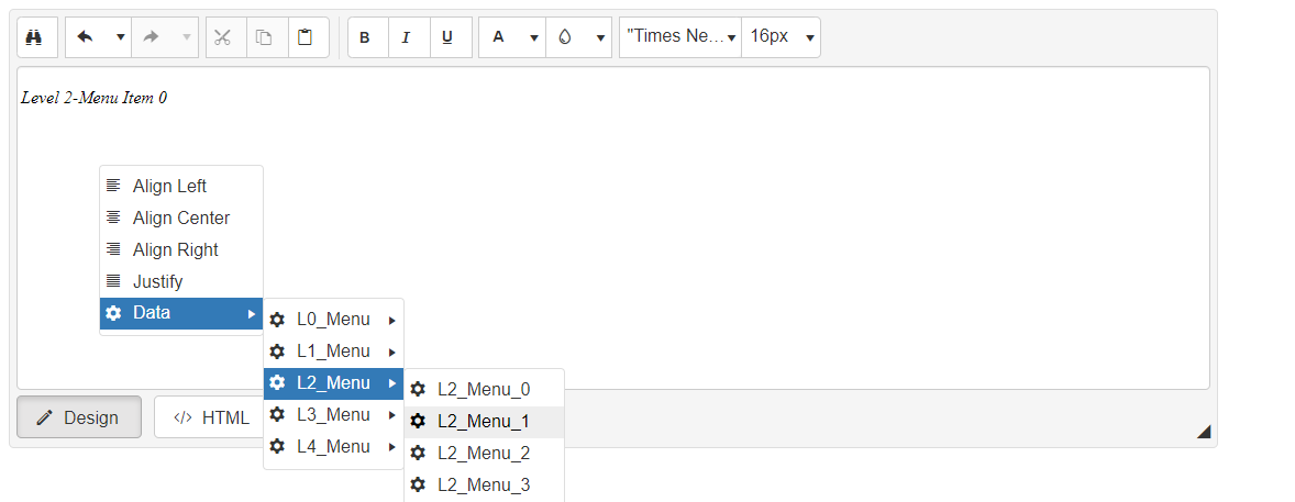 protected void Page_Load(object sender, EventArgs e) { EditorContextMenuTool dataMenu = new EditorContextMenuTool("Data"); dataMenu.Text = "Data X"; System.Text.StringBuilder sb = new System.Text.StringBuilder(); for (int l1 = 0; l1 < 5; l1++) { EditorContextMenuTool subDataMenu = new EditorContextMenuTool(); subDataMenu.Name = string.Concat("L", l1, "_Menu"); subDataMenu.Text = string.Concat("Level 1 Menu Item ", l1); subDataMenu.ShowText = true; subDataMenu.ShowIcon = false; for (int l2 = 0; l2 < 5; l2++) { EditorTool tool = new EditorTool(); tool.Name = string.Concat("L", l1, "_Menu_", l2); tool.Text = string.Concat("Level ", l1, "-Menu Item ", l2); tool.ShowText = true; tool.ShowIcon = false; subDataMenu.Tools.Add(tool); sb.Append("Telerik.Web.UI.Editor.CommandList[\"" + tool.Name + "\"] = function (commandName, editor, oTool) {debugger;editor.pasteHtml(\"<var>" + tool.Text + "</var>\");}"); sb.AppendLine(); } dataMenu.Tools.Add(subDataMenu); } RadEditor1.ContextMenus.FindByTagName("P").Tools.Add(dataMenu); RadEditor1.ContextMenus.FindByTagName("BODY").Tools.Add(dataMenu); ScriptManager.RegisterStartupScript(Page, Page.GetType(), "contextMenuHandlerScript", sb.ToString(), true); }