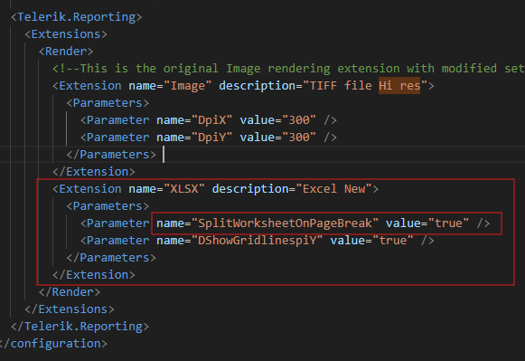 <Telerik.Reporting> <Extensions> <Render> <Extension name="XLSX" description="Excel new"> <Parameters> <Parameter name="SplitWorksheetOnPageBreak" value="true"/> <Parameter name="DShowGridlinespiY" value="true"/> </Parameters> </Extension> </Render> </Extensions> </Telerik.Reporting>We are storing trdx contents into DB and exporting using Report processor with device info. Please check below device info code and correct me if it is wrong.