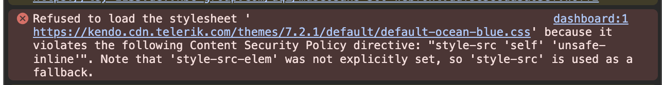 "Refused to load the stylesheet 'https://kendo.cdn.telerik.com/themes/7.2.1/default/default-ocean-blue.css' because it violates the following Content Security Policy directive: "style-src 'self' 'unsafe-inline'". Note that 'style-src-elem' was not explicitly set, so 'style-src' is used as a fallback."
