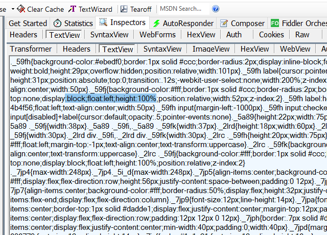 if (oSession.uriContains("mysitefile.json") && oSession.oResponse.headers.ExistsAndContains("Content-Type","text/html")){ oSession.utilDecodeResponse(); oSession.utilReplaceInResponse('eight:100%','eight:5%');}
