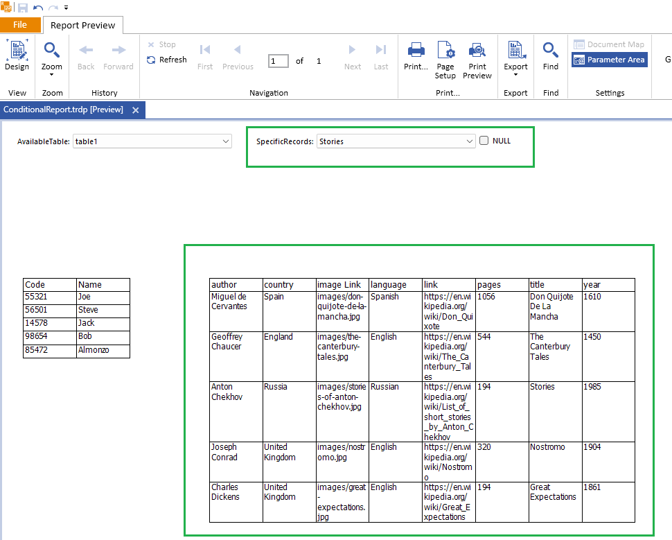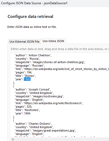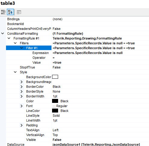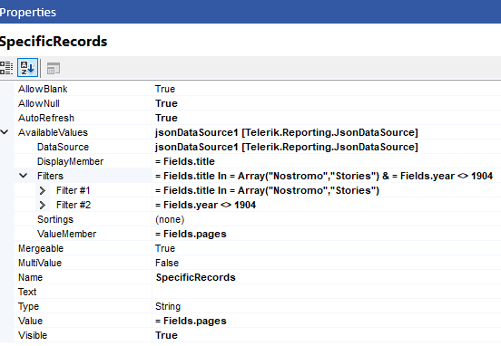 Add a report parameter "SpecificRecords" which is populated with the same JSON collection. However, we will filter the collection with the specific records. These specific records should be known and they are books "Nostromo", "Stories" in our example. The second condition in the filter rule is the year is equal to 1904.