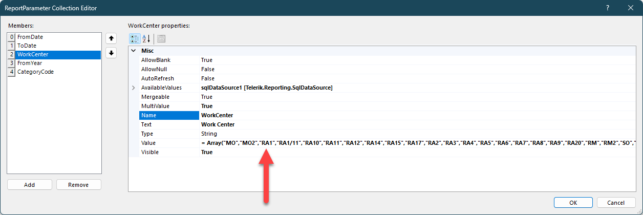 I have a report where I define multiple values to be auto-selected in the Report Parameters value Array. All the items in the Array are selected at report run time but one. I can select the one item on the fly, but I cannot figure out why it is not automatically doing it. The string in question is "RA1".  I am adding the report and screenshots.