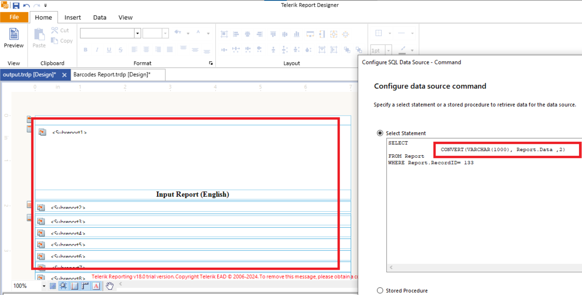 I am trying to pass a parameter of JSON type to my Telerik Report, like this: