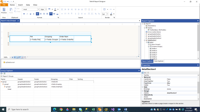 I tried making a group header for Pet, with a child of Grouping and then putting a page break at the bottom of the Grouping group but that didn’t work. I always get the result at the bottom here.