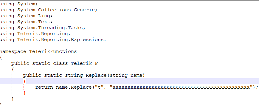 Hello Team, I'm trying to implement a User Defined Function to be access by Telerik Reports. Is a simple Replace function.