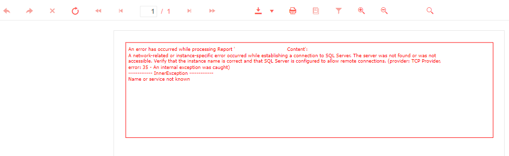 90 % of the time, we can render reports without issue. However, there are times where any report that uses a SQL connection seems to be unable to reach our primary database. EF Core (which interacts with the same DB prior to and after rendering reports) seems to never have this issue - even when Telerik does. Both share the exact same connection string. Rendering a report with an included SQL query returns something like the following: