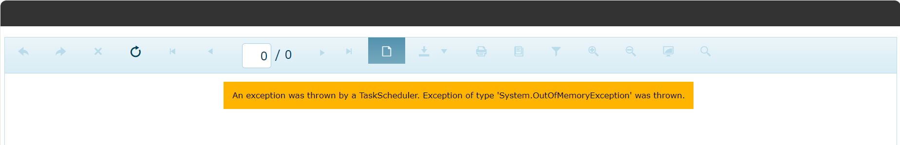 We have a .NET Web Application hosted in Azure. We have recently had reports of issues opening telerik reports with the error: An exception was thrown by a TaskScheduler. Exception of type "System.OutOfMemory" was thrown