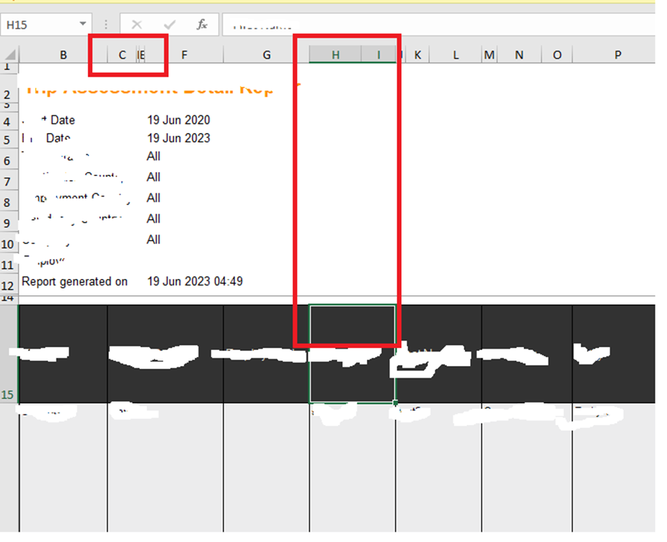 Following is a sample report exported as excel from viewer. It has a header section and data populated in the detail section using table wizard. But in excel the marked cells seems like merged. Each table column need to fit in one column. Anything to do while designing reports?