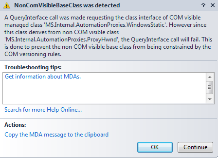 Manager.Settings.UnexpectedDialogAction = UnexpectedDialogAction.DoNotHandle; DownloadDialogsHandler handler = new DownloadDialogsHandler(ActiveBrowser, DialogButton.SAVE, @"D:\address.xls", Manager.Desktop); Manager.ActiveBrowser.WaitUntilReady(); Pages.abcd.FrameFrame1.DownloadlinkLink.Click(false); handler.WaitUntilHandled(9000); I am getting the attached exception and the file doesnot save.