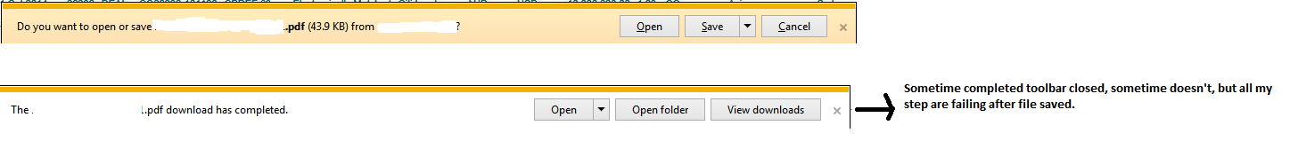 The download handler able interact with Save as dialog and save the file successfully all the time in IE 10 & IE 11, but toolbar is failed closes after file saved. I was playing with my code, but still no luck. I was able to run the below mention code in IE 10 & 11 10% of the time.