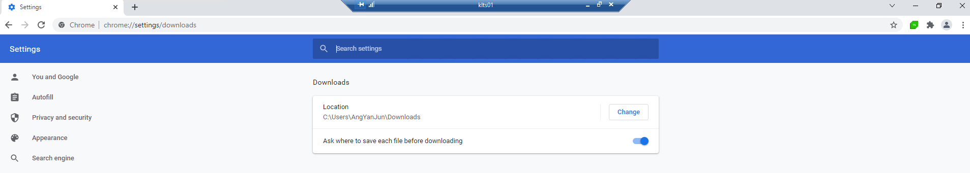 On top of this, open your Chrome browser on the machine where the tests fail to handle a dialog and paste in the address bar chrome://settings/downloads. Please, ensure that the second option Ask where to save each file before downloading is enabled. You can take a screenshot of this just to keep track of everything we discuss in this conversation.