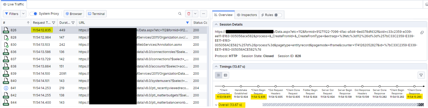 Hi there, I've used Fiddler occasionally for years, but am new to Fiddler Anywhere. I want to use Fiddler to accurately time page load times of my Dynamics 365 CRM system. I used to do this by filtering on the URL of my CRM system, clearing the traffic window, loading a page, clicking Ctrl+A in the traffic window to highlight all the sessions, and then reading off the total time from start to end (currently shown as the Max Duration figure in the Overview Window).