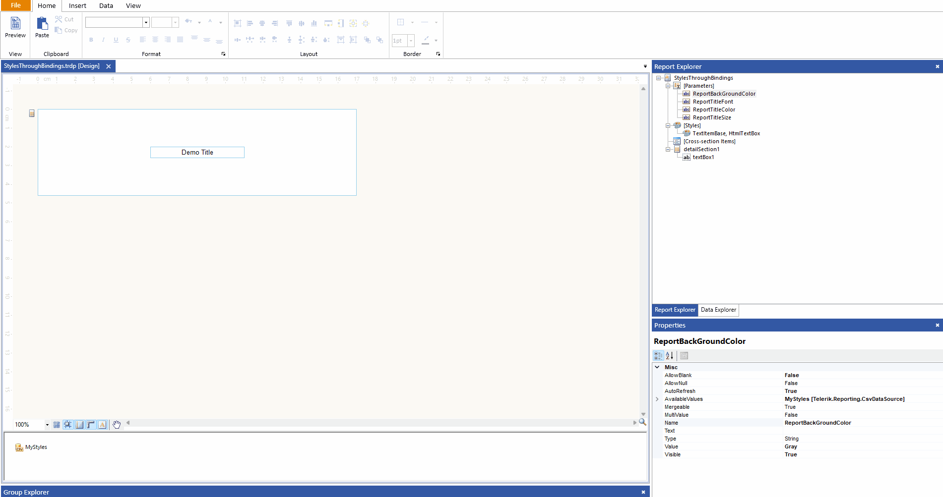 As a simple example, suppose I retrieve data that tell me the client wants Arial size 14 font for the title with gray background and Blue font color. These are stored as separate values that I retrieve from a stored procedure and the datasource is bound to the report. I created a mock report with the title, subtitle and rundate textboxes placed where they should be in the header section.