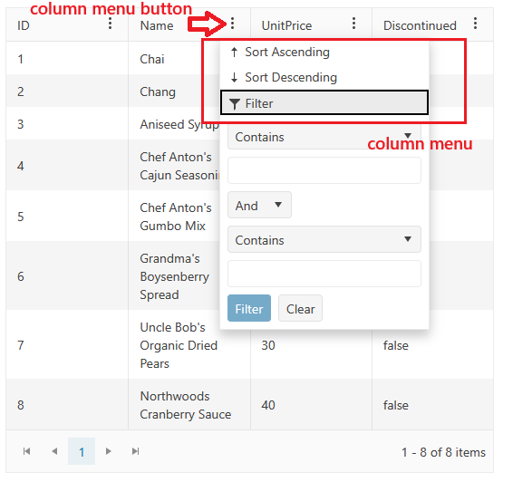 -> If I set :columnMenu="true", I can see a list of menus like sort ascending and it also has 'Columns' menu which shows or hides columns by checking or unchecking check boxes.