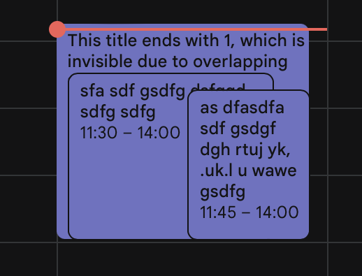 Google Calendar's approach seems to rely on a fixed font size and text height, which we don't have the luxury to assume lightly. And even their overlapping approach doesn't work well if the appointment titles become longer or there is not enough horizontal space: