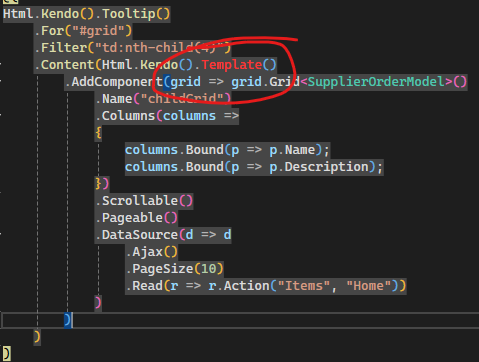 What I need is a tooltip that renders the results of a partial view when user hovers a specific column (column #6) in the kendo grid (mvc razor). I need to show a list of active orders for the given row in the grid.