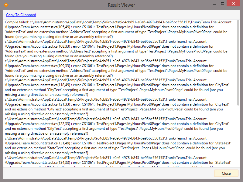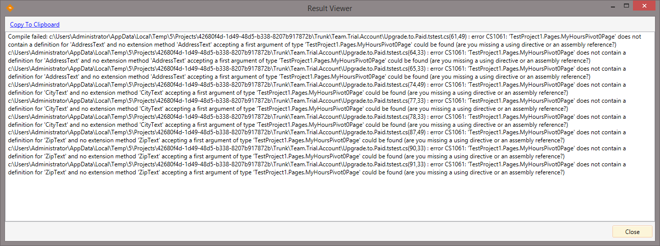 Compile failed: c:\Users\Administrator\AppData\Local\Temp\5\Projects\42680f4d-1d49-48d5-b338-8207b917872b\Trunk\Team.Trial.Account\Upgrade.to.Paid.tstest.cs(61,49) : error CS1061: 'TestProject1.Pages.MyHoursPivot0Page' does not contain a definition for 'AddressText' and no extension method 'AddressText' accepting a first argument of type 'TestProject1.Pages.MyHoursPivot0Page' could be found (are you missing a using directive or an assembly reference?)
