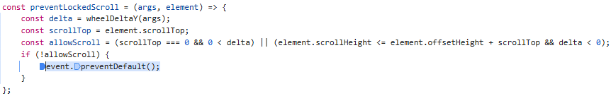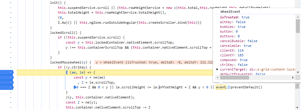 event is WheelEvent here, which is good. However, when I do same thing in my application (try to scroll over locked column), I get an error because event is undefined in the exact same place:
