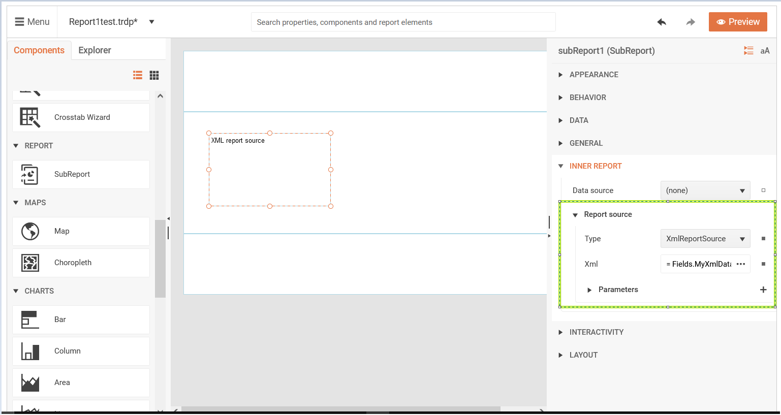 Then, you may use the SqlDataSource Component to retrieve the XML from the database. You may assign this data source to the report's DataSource property so that you may access the field with the XML(e.g. =Fields.MyXmlData) or you may use the data source through a Report Parameter