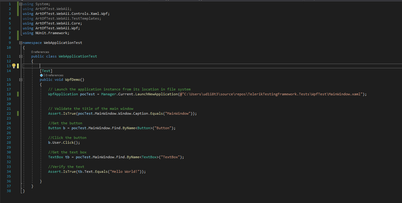 I'm using VS 2019 Enterprise with Telerik Testing Framework. I'm using examples provided by your support document part 'WPF UI Automation'. I have added ArtOfTest.WebAii in the reference and created a test. But when running the test I keep getting the System.NullReferenceException. Can you help me out?