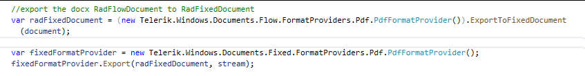 var radFixedDocument = (new Telerik.Windows.Documents.Flow.FormatProviders.Pdf.PdfFormatProvider()).ExportToFixedDocument(document);