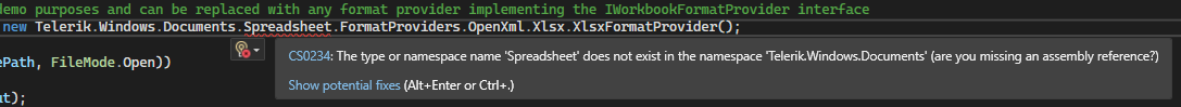 IWorkbookFormatProvider formatProvider = new Telerik.Windows.Documents.Spreadsheet.FormatProviders.OpenXml.Xlsx.XlsxFormatProvider();