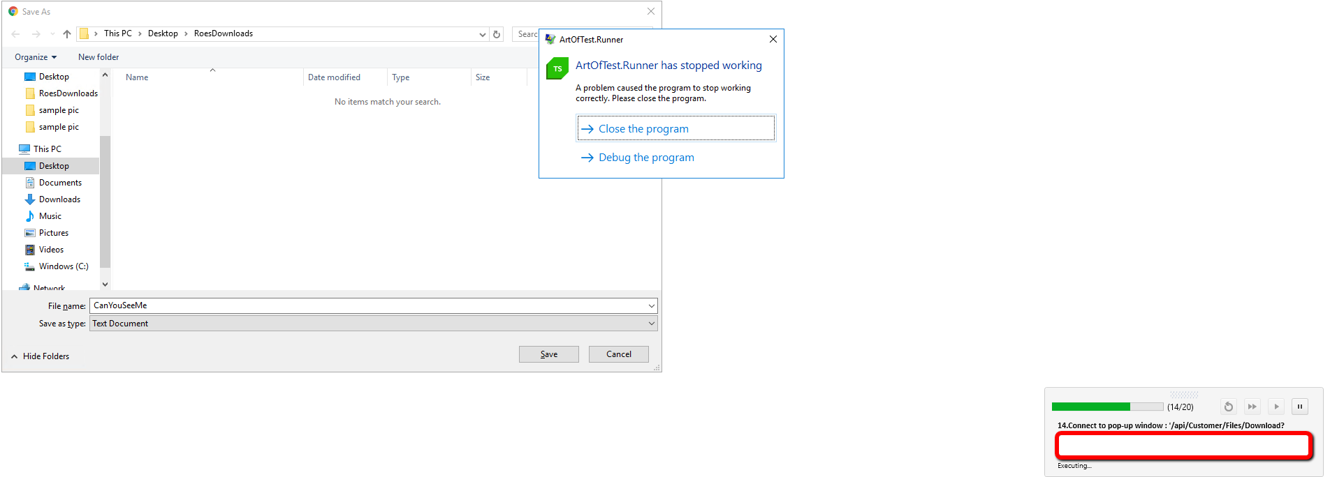 The exception doesn't appear until I close the download dialog or tab manually after moving past the"ArtOfTest.Runner has stopped working" prompt. I noticed that it doesn't even try to fill in the download dialog, too.