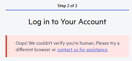 "Oops! We couldn't verify you're human. Please try a different browser or contact us for assistance."