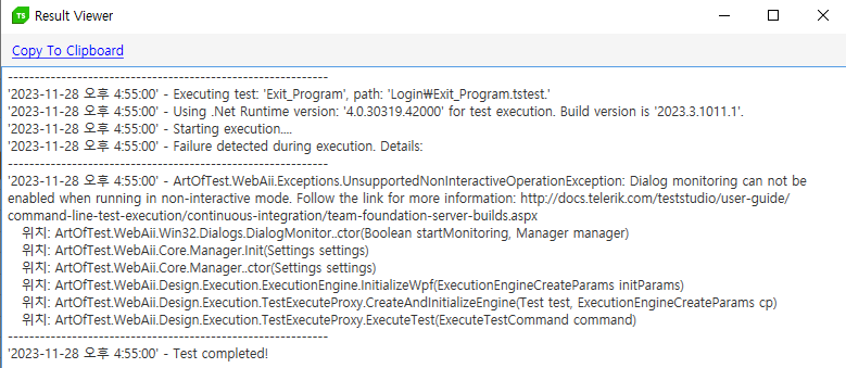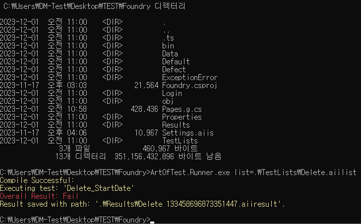 > ArtOfTest.Runner.exe list=.\TestLists\Delete.aiilist Compile Successful: Executing test: 'Delete_StartDate' Overall Result: Fail Result saved with path: '.\Results\Delete 133458704024418978.aiiresult'
