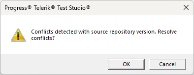 When I select "OK", the modal alert box goes away, but the conflict isn't resolved, and this error is displayed each time I try to check in either of these 2 files. In VS, I'd expect a merge window, with 2 panes and diff code highlighted, but nothing like that shows up.