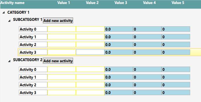 This is my hierarchy. "Value1", "Value2".. from the photo are actually Activity's property (Name, NoPerYear,StandardService,Unit, StandardWorkload, CalculatedRequirement)