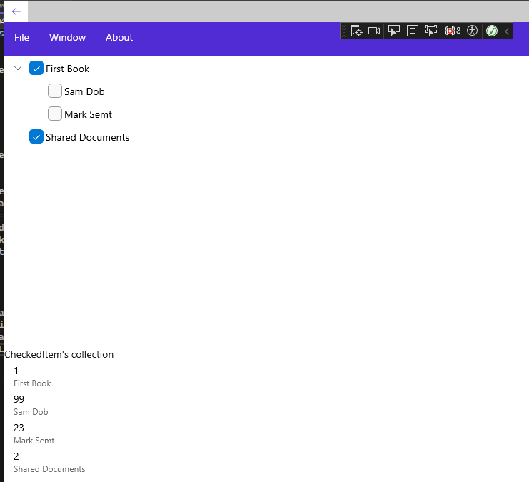 When checking items through the UI and for example bind the checked items collection to the ListView, The control is populated with the items, for example: