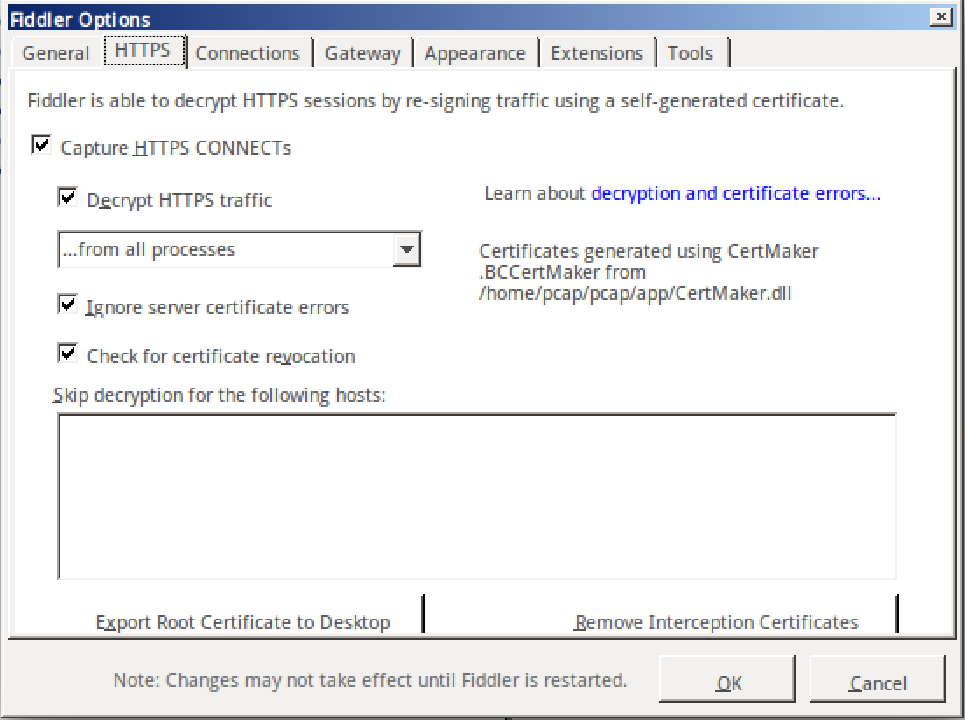 I'm trying to use fiddler v4.4.8.4 in my ubuntu 14.04 virtual machine to capture https connections, and I get "secure connection failed". Of course, when I close fiddler or don't check cature https connects, firefox works well.