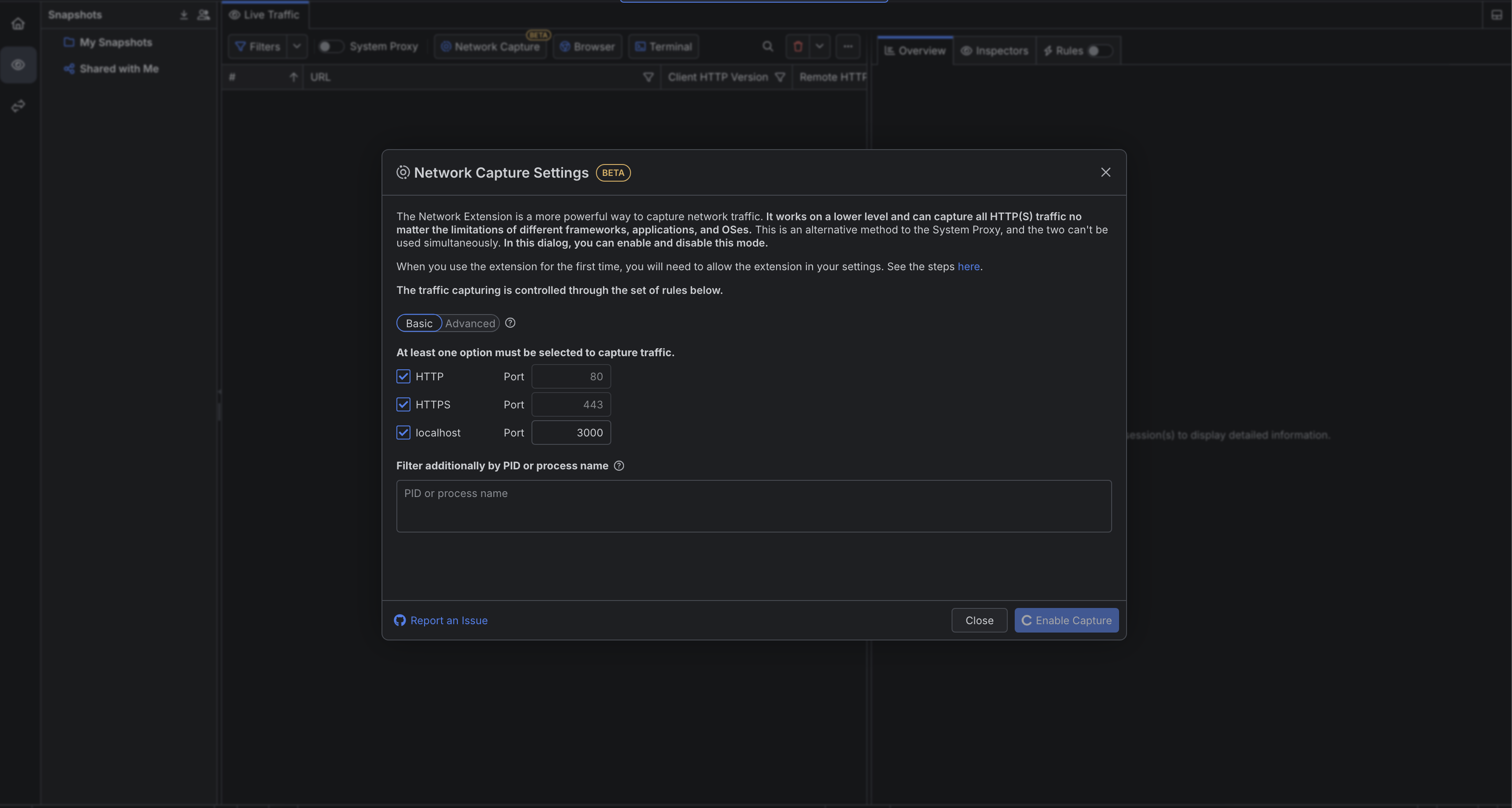 I disabled System proxy and tried to enable "Network Capture" with basic settings, but it's keep spinning and not enabling this feature.