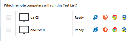Now I go into Test Lists, Run Remotely select both machines to execute in Firefox. So seems like the test gets kicked off in one of my machines(this is my local machine), but nothing happens in my other executing machine . Also the test list report in my calendar is yellow and does not change to red or green. It seems like the tests are stuck but I don't know why its not able to kick off the test on one of the machine when its able to do in the other machine. Any help would be appreciated. This is one of the criteria I am evaluating the tool against and would like to know the result .