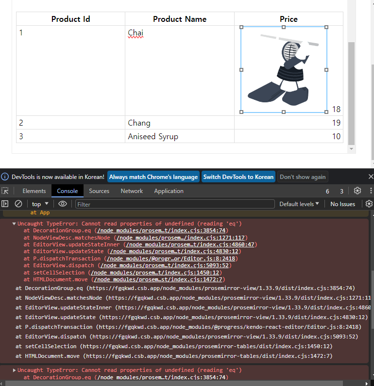 When I create some document work tools with kendo UI(react) that can edit grid and image at the same time, I found that I am getting the image resize error as below. And I am having a problem that I cannot save the resized image.