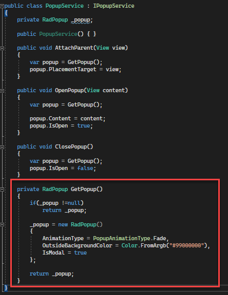 • Additionally, I wait to instantiate the RadPopup until the very first caller asks for it. This will ensure it will never be used too soon. Here's a quick callout from the service's definition: